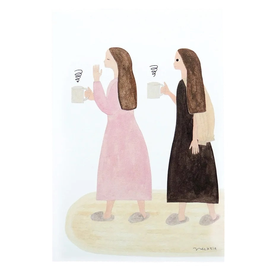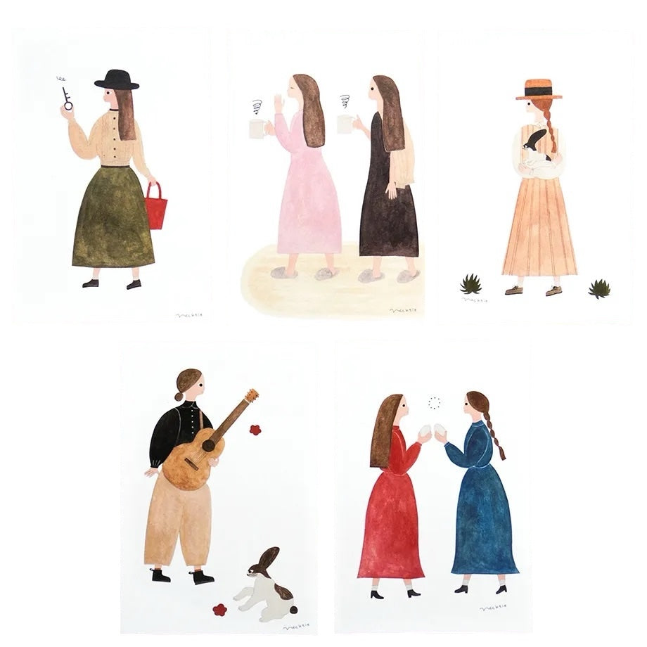 These postcards by Japanese illustrator Necktie are fun to have in your writing drawer to send a note to a friend a pic one to frame or washi tape on a wall. They are sweet illustrations with themes such as friendship, who doesn't want to hold a warm bunny, or perhaps the one with a woman holding a key is a nod to someone getting a new home or car.