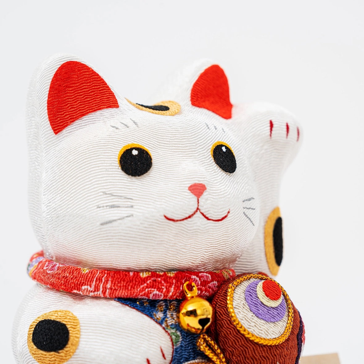 Experience the allure of Japanese folklore with the Beckoning Neko Cat, featuring a small hammer (小槌). Made with traditional chirimen fabric, this beckoning cat symbolizes the attraction of wealth and good fortune. The small hammer it holds is a powerful symbol in Japanese culture, believed to grant wishes and bring prosperity. This beckoning cat, complete with a stand and mat, is designed for easy placement in any space, inviting good fortune and prosperity with its charming presence.