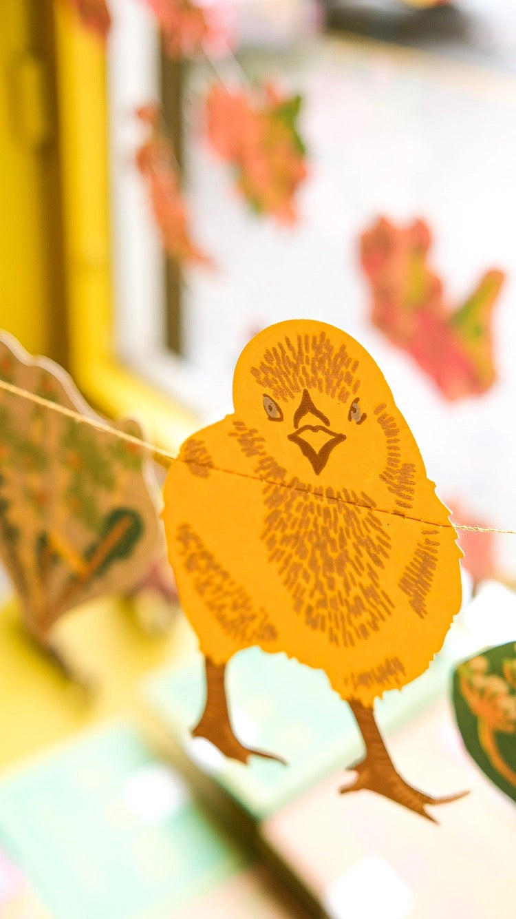 Filled with daffodils, fluffy chicks and rabbits; this garland is a classic for Spring time decorating.
