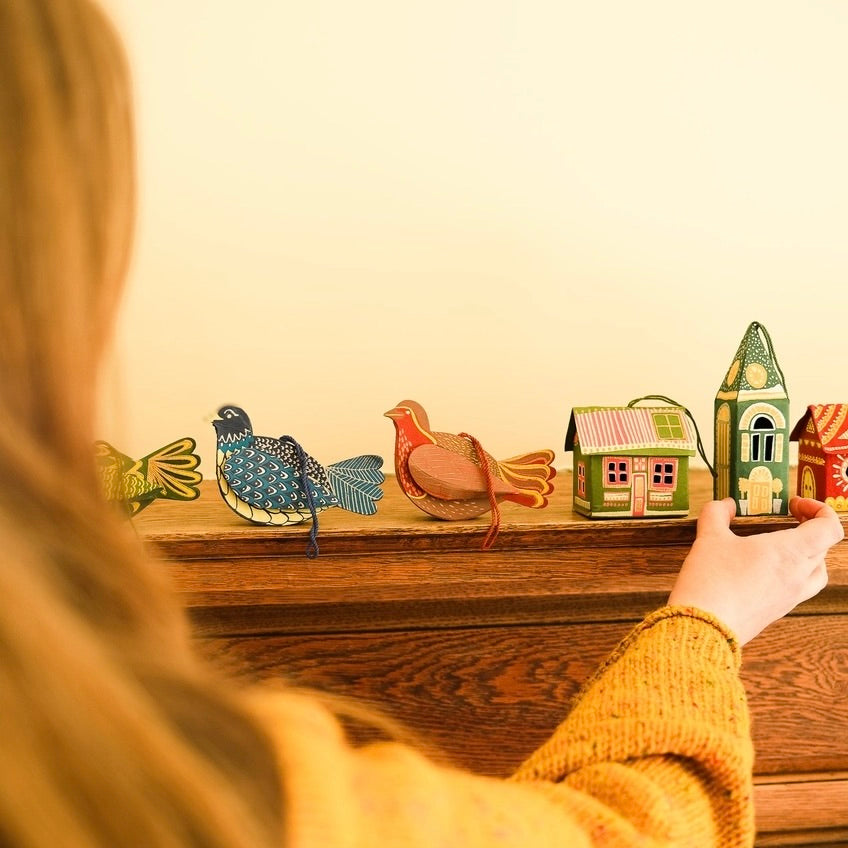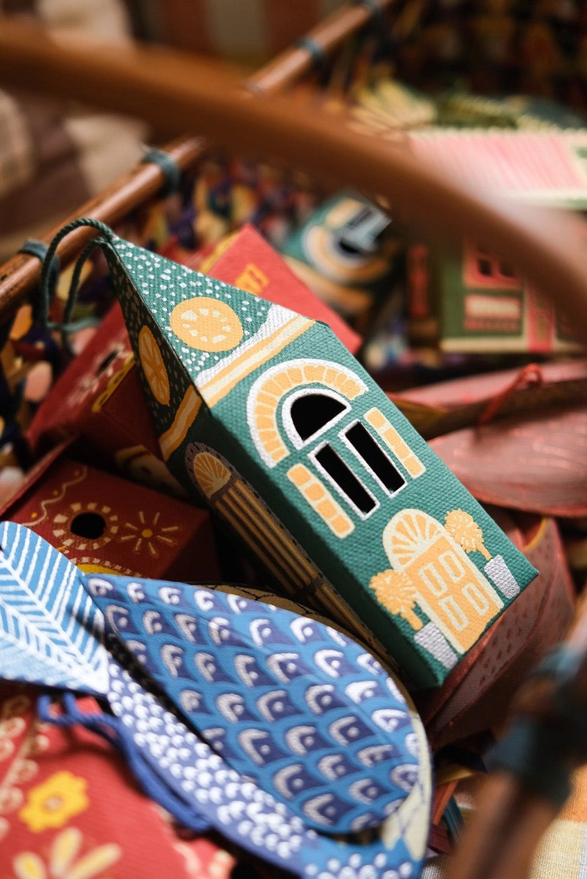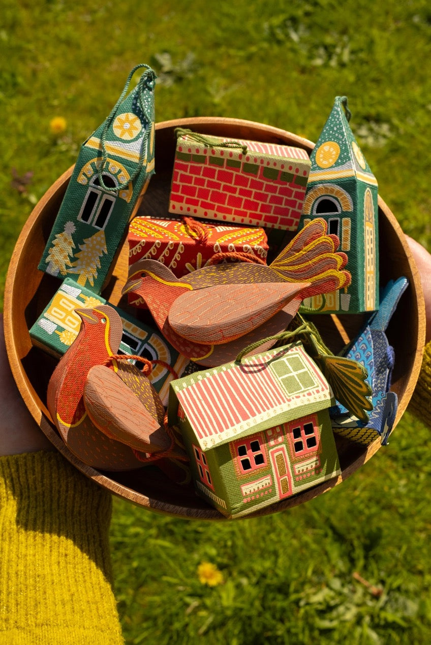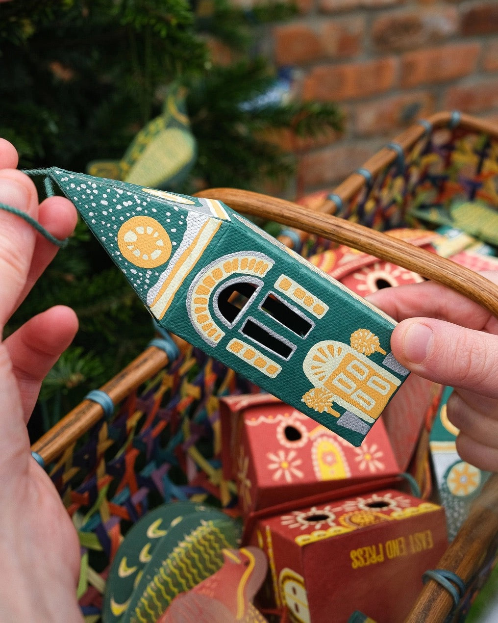 Screen printed board ornament, sustainably made from 100% recycled paper. A cute red house decorated with a classic gingerbread motif!