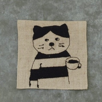 Shion Sugawara is an embroidery artist who creates these wonderfully expressive cats. Black embroidery on a natural linen coaster. Share your cup of coffee with these adorable characters!