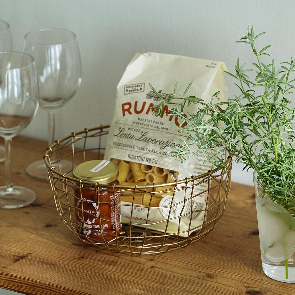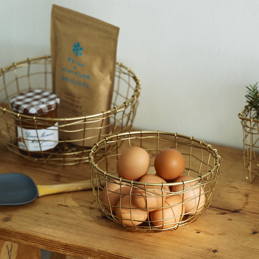 This handmade basket, crafted from gold wire, is perfect for versatile storage. Use it in the kitchen to hold fruits and vegetables, and sewing materials. It’s a practical for various storage needs.