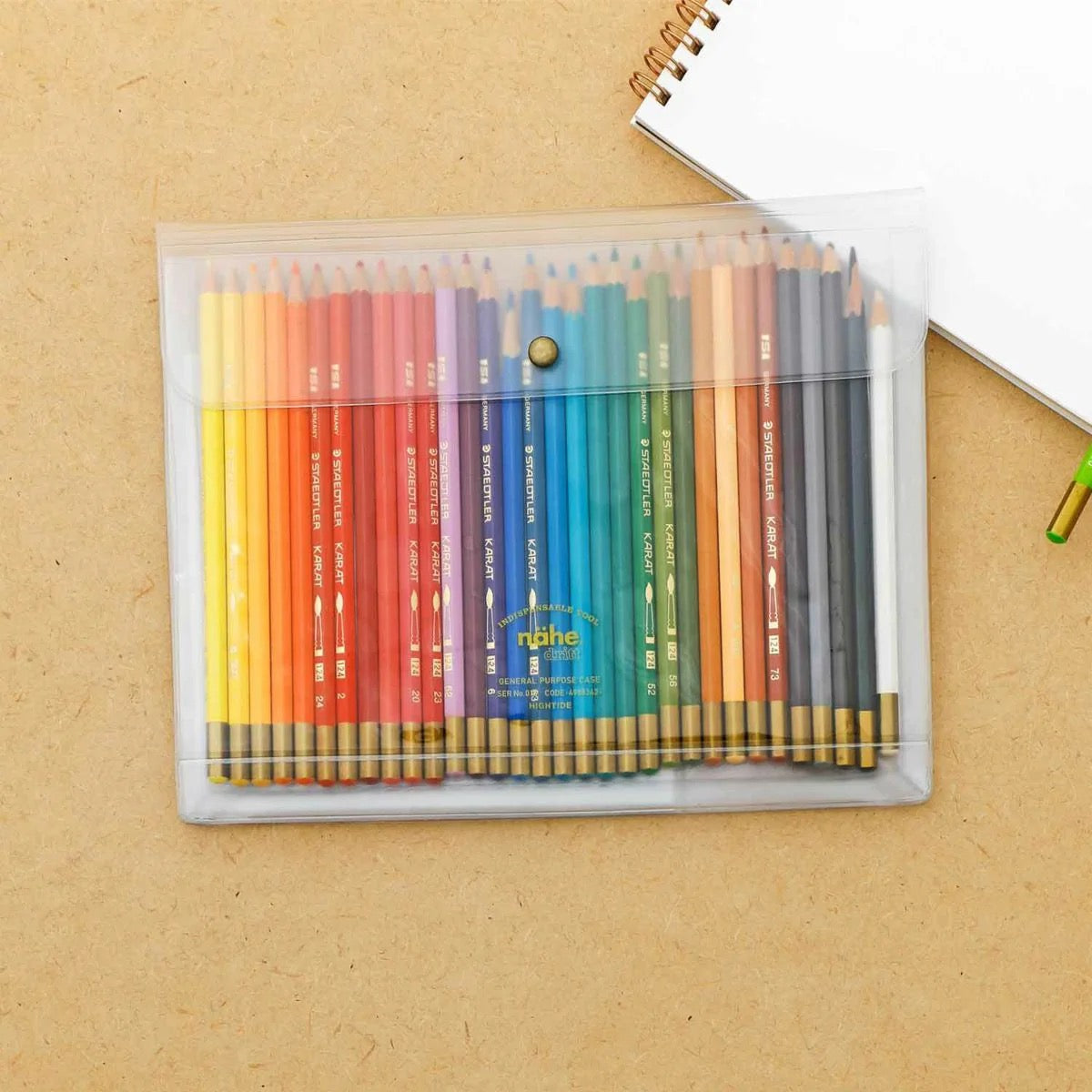 A gusseted general purpose case made of PVC with a transparent front by Hightide. This is the A5 size. A stylish way to hold, notebooks, papers, receipts, stationery, stickers, etc! Available in assorted colors with a clear front so you can see everything inside. Easy snap closure. Oddly pleasing we think!