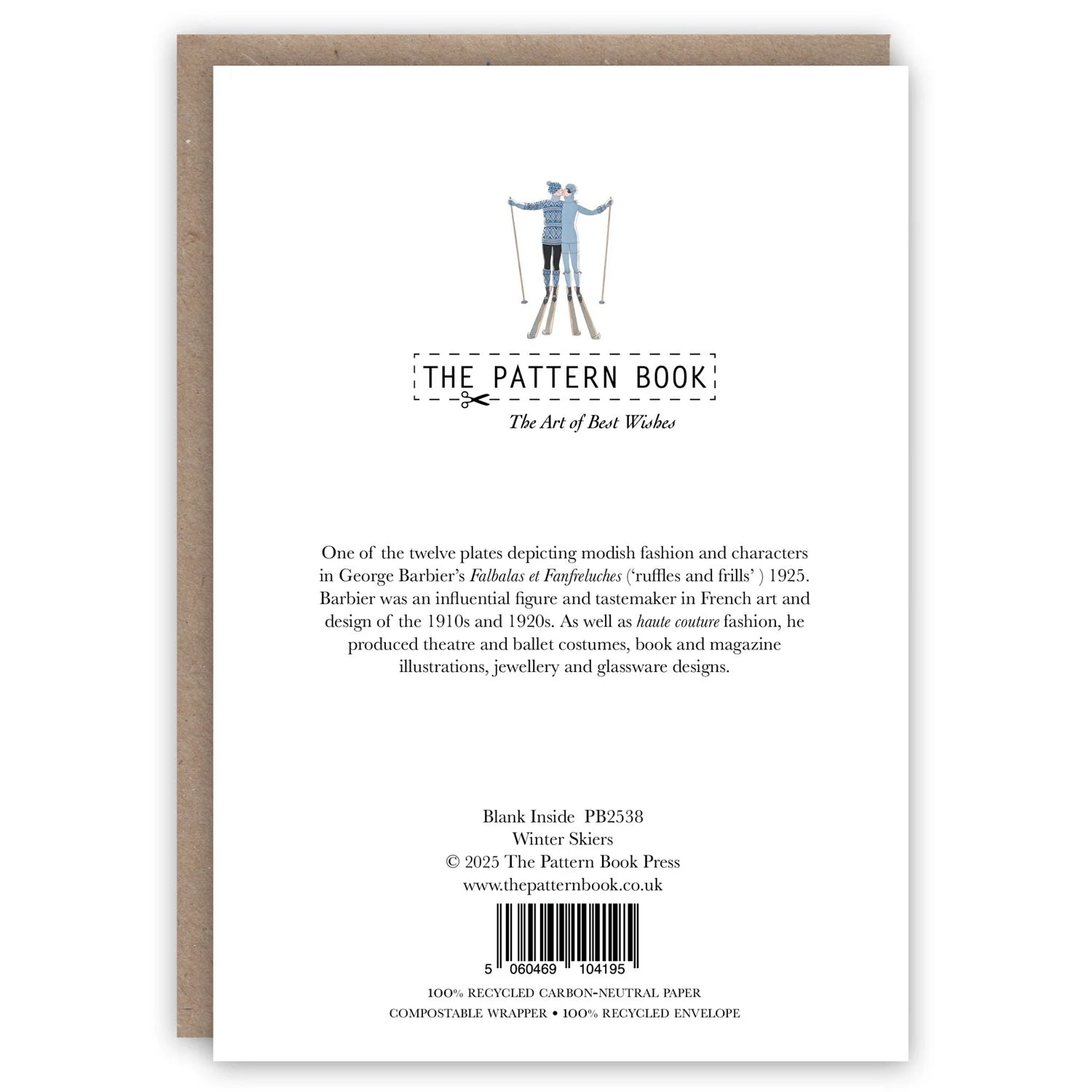 Christmas or Valentines card depicting skiers kissing on the slopes. Printed in England on a light cream, 300gsm carbon-neutral Italian paper, made from 100% recycled post-consumer waste.