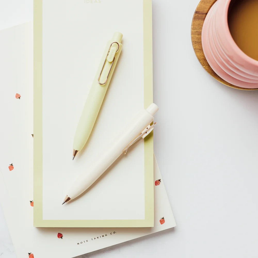 Limited Edition Uniball One P with Rose Gold clip, available in Yogurt and La France (light green)!
