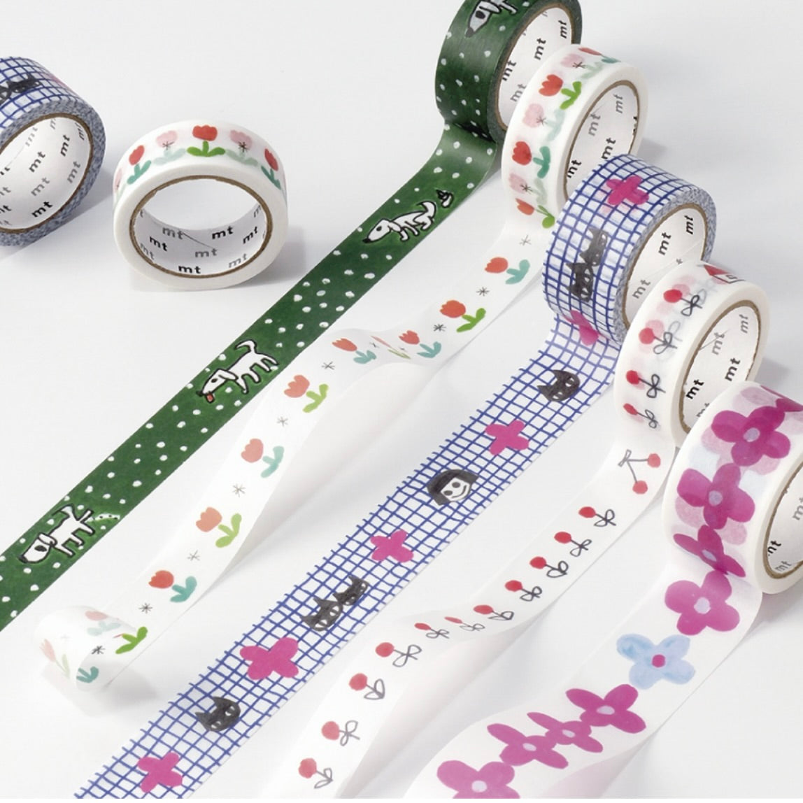 We love the vivid, painted prints on the MT washi tape of Japanese printmaker and artist, Makoto Matusbayashi . Cats, dogs, flowers, girls - all charming subjects by Matsubayashi san - we encourage you to gaze at them all. Very hard to choose just one.