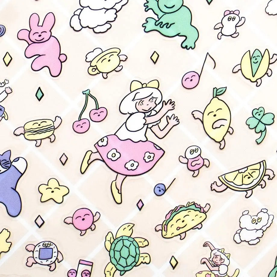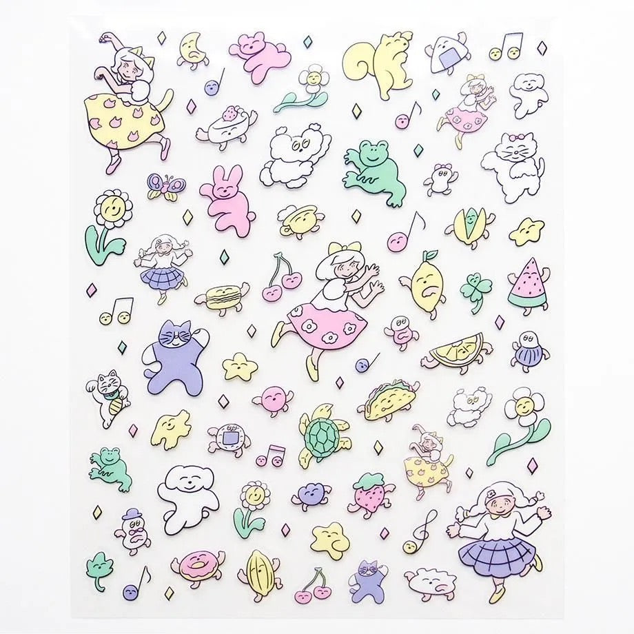 Sheet sticker by illustrator Kitazawa Heisuke. Let's dance together with the fun music of the smile! Girls, frogs and cats, tacos, rice balls, dumplings and watermelons all seem to be having fun. Like being back in Y2K!