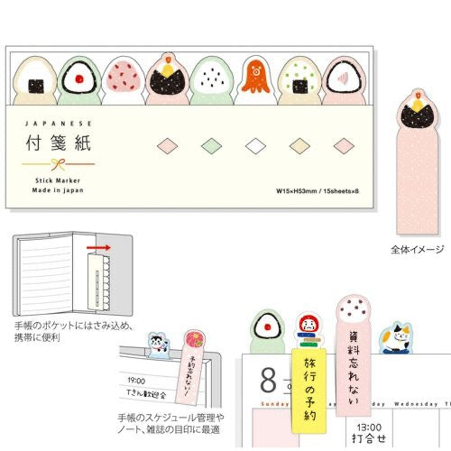 Set of fun onigiri themed page marker/tabs for keeping "tabs" on specific portions of your notebook, calendar, or book. Very handy for making small notes that you can move around the page.